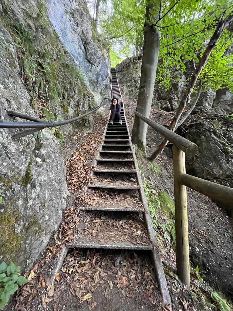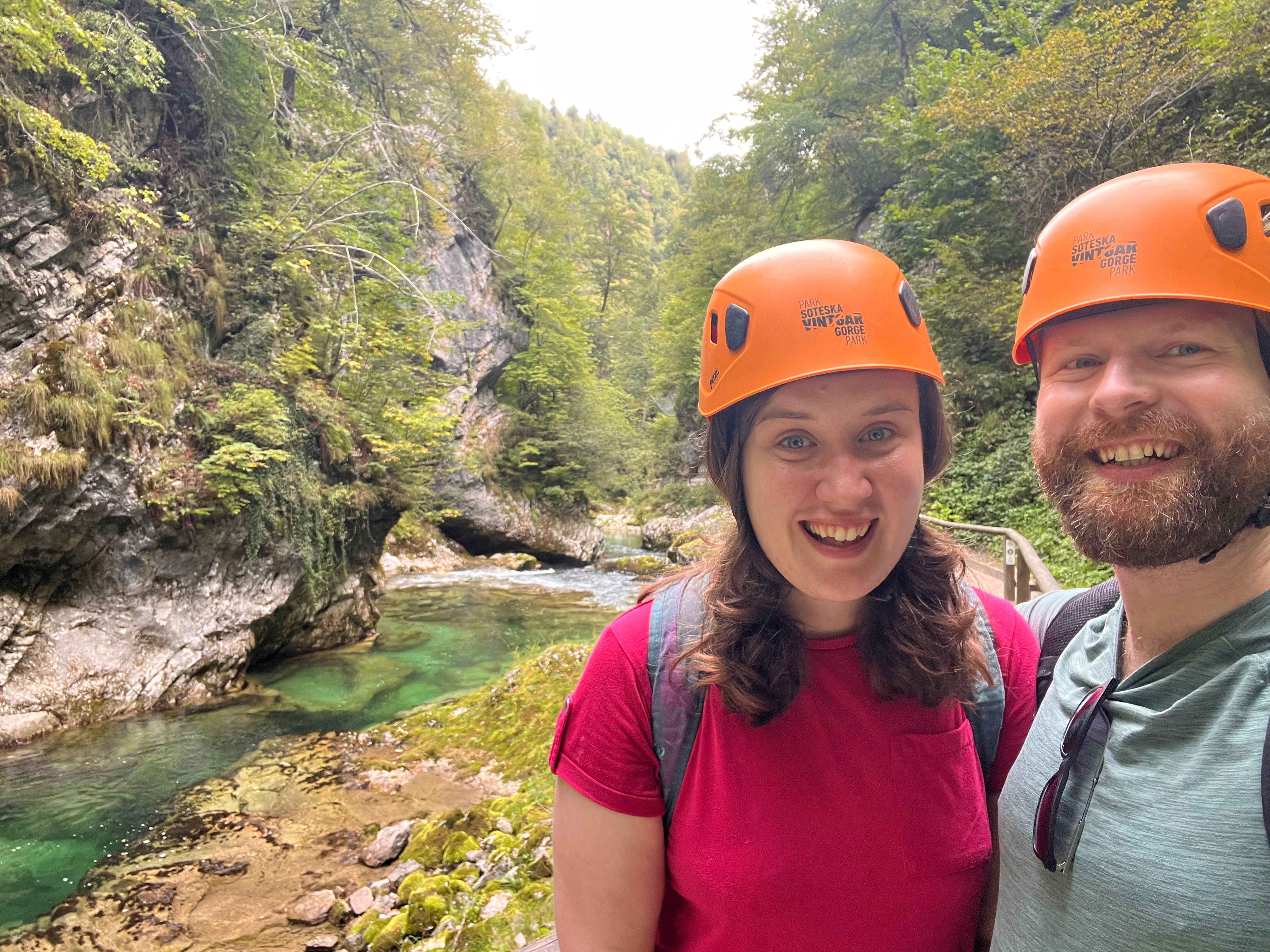 Next up was another one of the main attractions of the area – Vintgar Gorge. The gorge is a 1600m-long, 250m-deep canyon that’s 4km from Bled. There’s a free shuttle bus from Bled bus station, and we used it successfully despite mass confusion as to whether it ran every 20 minutes, every 30 minutes or indeed every hour. Tickets for the gorge must be purchased online in advance, and entry cannot be scanned until your exact timeslot (ours was at 10:43 and not a minute sooner). After scanning in, we were given helmets, then we walked down a series of boardwalks, bridges, and pathways beside the gorge. It was one of my favourite experiences of the trip: the water crystal clear, the air cool and fresh, and the surroundings exquisite.