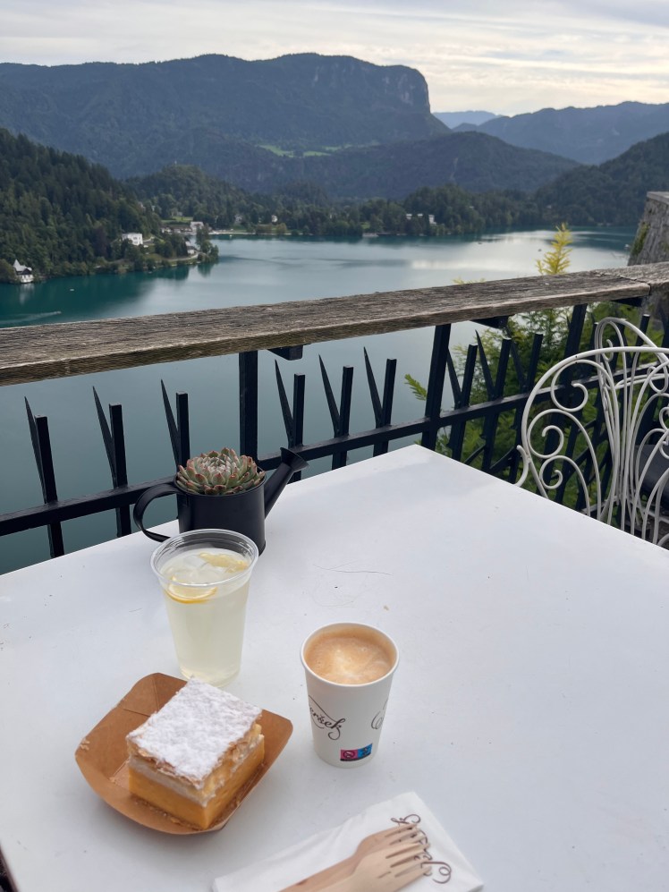 We visited late afternoon, when the crowds were gone, and with no queue at the cafe, we decided it was time to try the famous Blejska kremšnita, or Bled cream cake. The layers of pastry, custard and whipped cream really are delicious, and having sampled both the cake at the castle and the ‘official’ cake by the lake, I think that the castle one is better! It had a great wobble to it, and the mesmerising view from the cafe made it even more scrumptious.