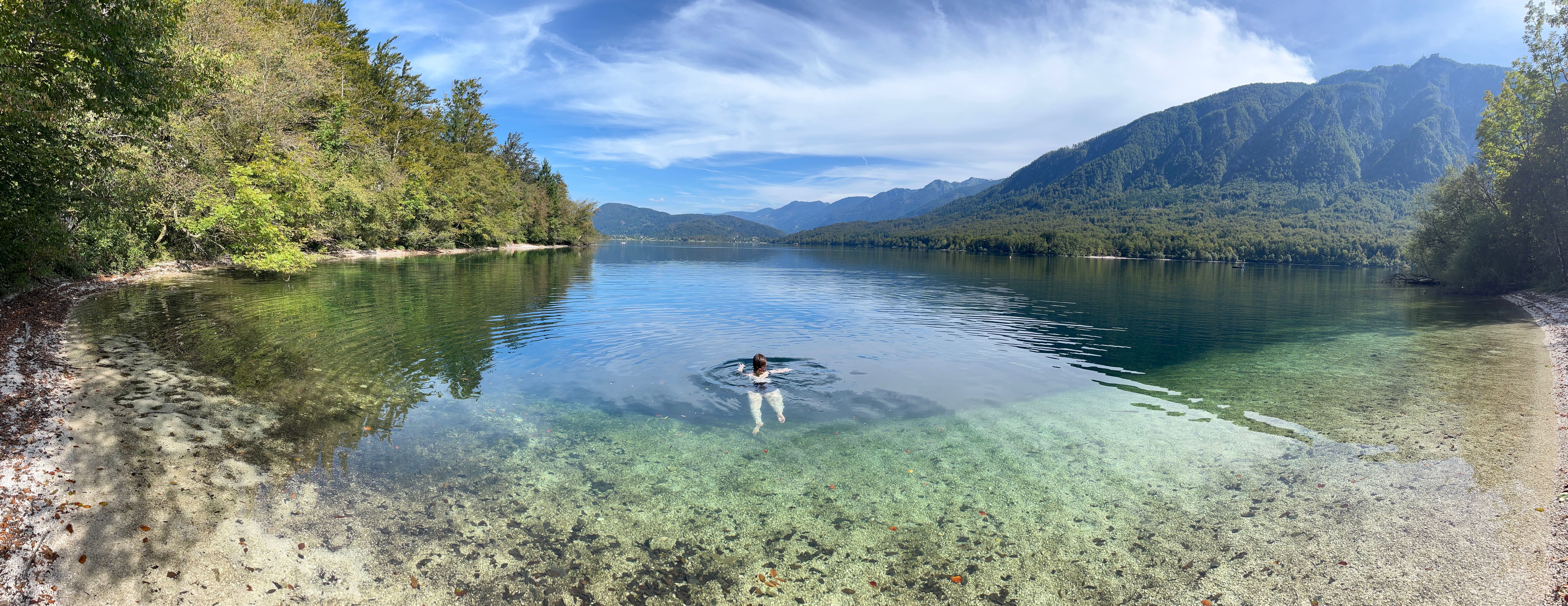 The other must-do Lake Bled activity is swimming! There are three spots where you can swim, and one of them is paid. The paid bit was cheaper after 3pm and 100% worth it for the lack of crowds, plus sunbeds, lifeguards, and a chute. It felt surreal to swim in such a picturesque landscape, looking across to the island and up to the castle. There was also a cordoned-off swimming pool for lengths, but I loved the feeling of swimming free in the lake. Plus, when it’s 26°C outside, the water doesn’t even feel that cold.